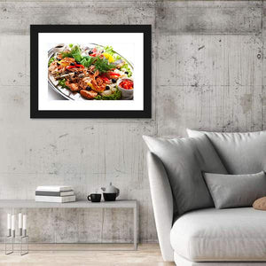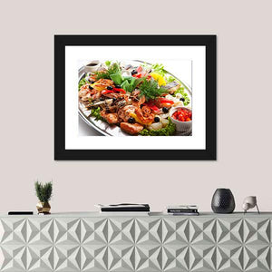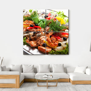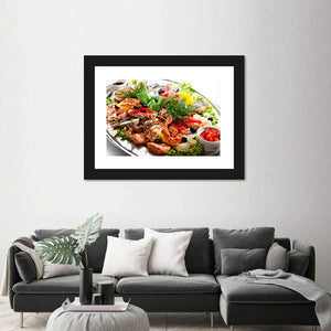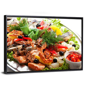 This vibrant canvas art features a beautifully arranged seafood platter topped with shrimp, fish, and squid alongside fresh vegetables and dips. The appetizing colors of red, green, and orange create a fresh and inviting atmosphere that works well in any kitchen or dining area.