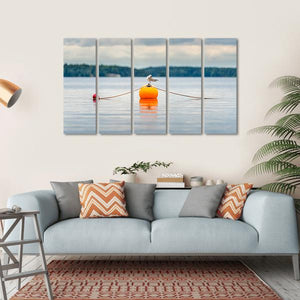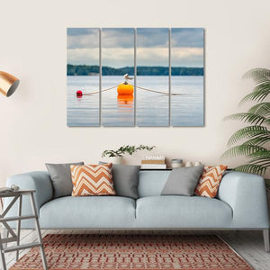 This canvas art captures a serene scene of a seagull perched on a vibrant orange buoy, set against a calm backdrop of water and an overcast sky. The tranquil palette of blue, gray, and green invites a soothing atmosphere, making it a wonderful addition to any room decor.