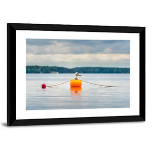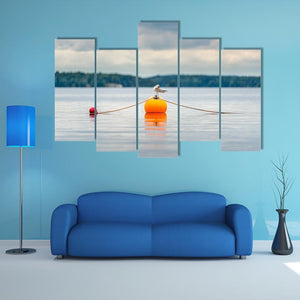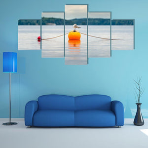 This canvas art features a seagull perched serenely on an orange buoy, surrounded by tranquil water. Its calming colors of blue and grey bring a peaceful atmosphere to any space.