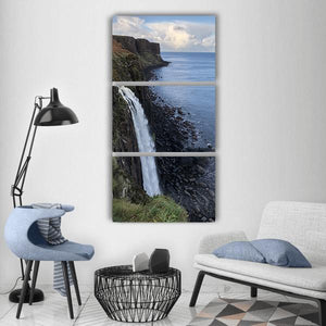 Kilt Rock and its cascading waterfall on Scotland’s rugged coast are captured in a realistic landscape canvas. The high-angle composition and a palette of blues, grays, greens, and browns convey a dramatic, wild yet serene atmosphere. Fits well in coastal or modern room decor.
