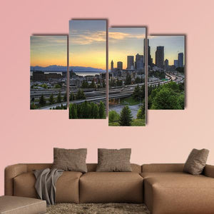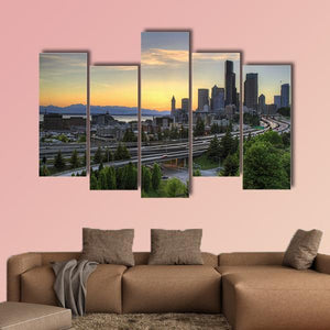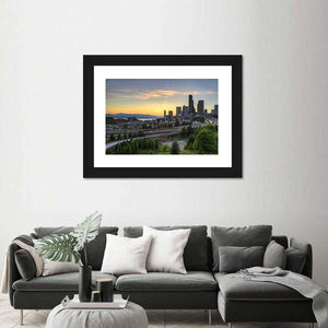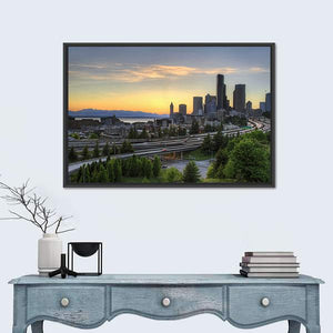 Seattle Washington Skyline At Sunset shows the city skyline at dusk with water, distant mountains, dense trees and a winding freeway, painted in blue, orange, green and gray. Its calm, serene urban mood and rule-of-thirds composition suit modern living spaces.