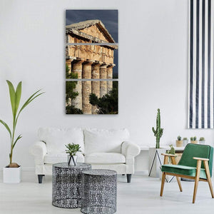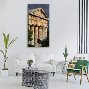 Segesta Temple In Italy captures ancient temple columns and surrounding foliage in a realistic, photographic landscape. Textured stone, an overcast sky, and a low-angle composition create a historic, serene, and dramatic atmosphere that suits modern or earthy rooms.