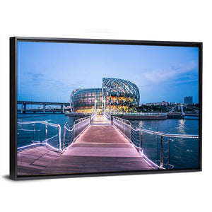 This captivating canvas features modern architecture along a tranquil waterfront in Seoul, bringing an inviting atmosphere to your space. With a harmonious palette of blue, brown, and purple, it captures the essence of a bustling city at dusk.