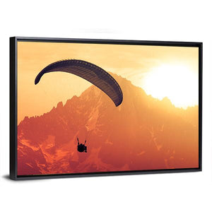 This canvas art captures a silhouetted paraglider soaring over breathtaking Alps peaks at sunset. The warm hues of orange and brown evoke a sense of adventure and calm, making it a captivating addition to any room.