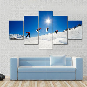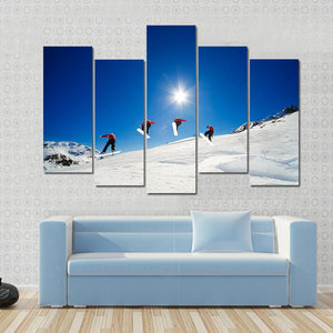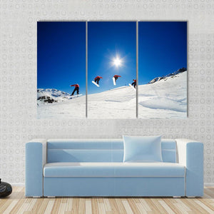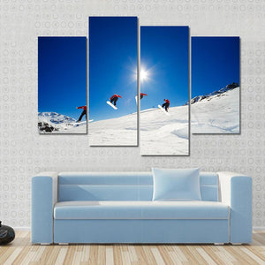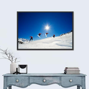 This canvas wall art features an energetic scene of snowboarders in mid-air against a backdrop of snowy mountains and a bright sky. The dynamic composition captures thrilling action with a sunburst effect, making it an eye-catching piece for any sports enthusiast.