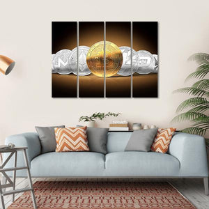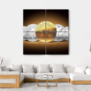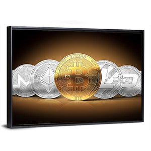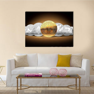 This captivating wall art features striking cryptocurrency coins, including a prominent gold bitcoin at the center. With a modern and sleek digital atmosphere, it adds a touch of financial flair to your space.