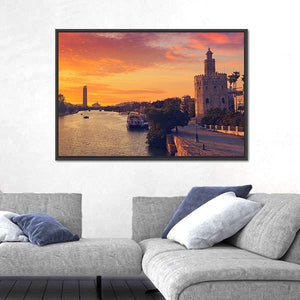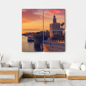 This canvas art features a stunning view of Seville, showcasing a historic tower against a vibrant sunset sky. With warm hues of orange and pink, it evokes a serene and majestic atmosphere, perfect for enhancing your living space.