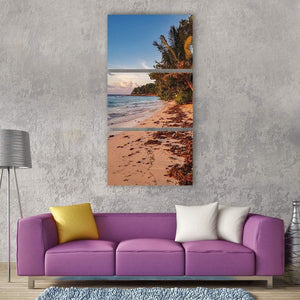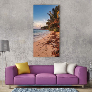 Seychelles Beach At Sunset captures a tranquil tropical shore with palm trees, gentle waves, and seaweed on the sand. The photorealistic print uses warm oranges, blues, greens, and soft whites to create a peaceful, warm mood that works well in coastal, modern, or nature-inspired rooms.