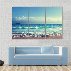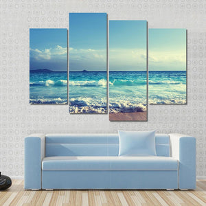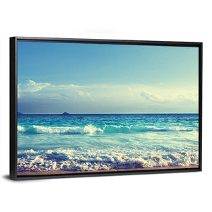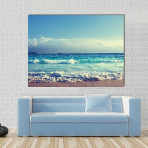 This artwork captures a serene beach at sunset, showcasing foamy waves and distant islands. The tranquil blues and soft whites evoke a calming and refreshing atmosphere, perfect for any space seeking a touch of nature.