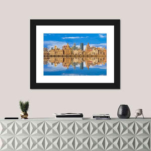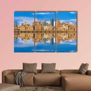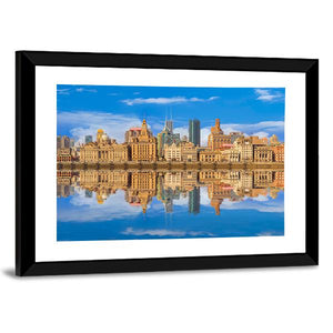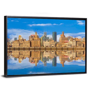 Shanghai Bund Canvas Wall Art shows the city skyline along its river with reflective symmetry between ornate and modern buildings. The realistic scene uses a calm palette of blue, yellow, brown and white to create a serene, urban mood. It works well in modern living rooms or offices as architectural wall decor.