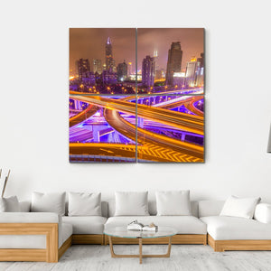 Experience the vibrant cityscape of Shanghai with this canvas wall art featuring a dramatic aerial view of a highway interchange at night. The energetic blend of orange and purple hues, along with striking light trails, captures the futuristic essence of urban life.
