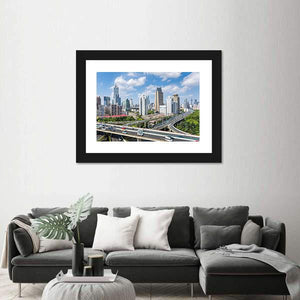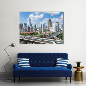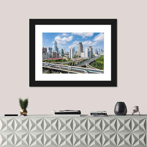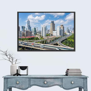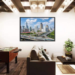This canvas art captures the vibrant skyline of Shanghai, showcasing a bustling highway interchange and towering skyscrapers. With its photorealistic style and energetic mood, it’s a striking addition to any modern decor.