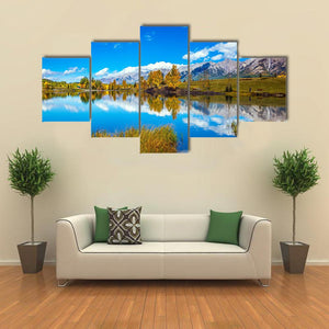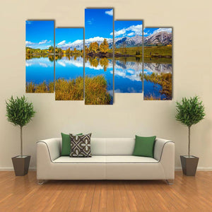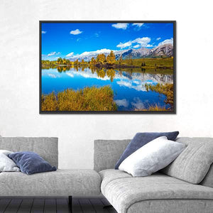This landscape canvas features a serene scene of mountains reflected in a tranquil lake, surrounded by vibrant autumn colors. The peaceful palette of blue, green, and hints of yellow brings the beauty of nature into your space.