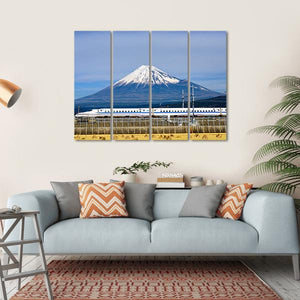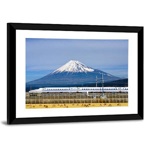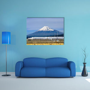 Experience the serene beauty of Japan with this canvas artwork featuring Mount Fuji and the iconic Shinkansen bullet train. The modern, realistic style captures a majestic landscape, blending shades of blue and white with a hint of earthy brown.
