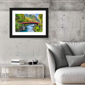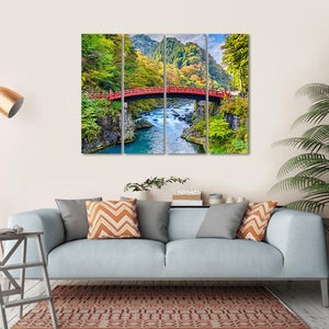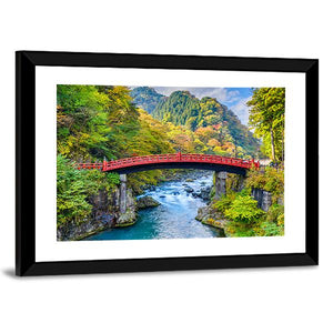This canvas wall art beautifully depicts the serene Shinkyo Bridge, surrounded by vibrant autumn foliage and a gentle river. The realistic portrayal captures the essence of Japan's natural beauty, making it a captivating addition to any space.