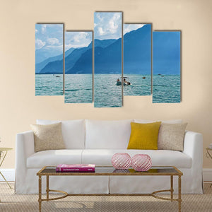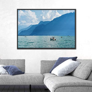 Ship At Geneva Lake depicts a calm lakeside landscape with mountains, a small boat carrying people, and a blue-green palette that feels serene and vast. The composition uses depth and the rule of thirds to draw the eye across the scene. Suits modern or nature-inspired rooms as a peaceful wall accent for home decor.