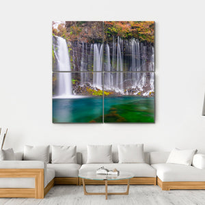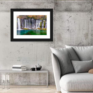 This canvas art beautifully captures the serene Shiraito Waterfalls, surrounded by lush forest and rugged rocks. The photorealistic depiction features a calming palette of greens, blues, and browns, evoking a peaceful atmosphere perfect for any nature-inspired decor.