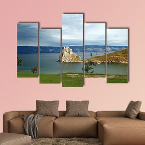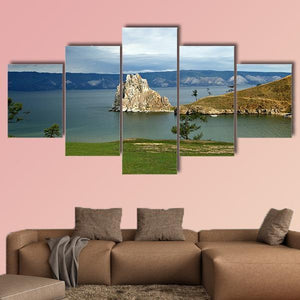 Shore Of The Island Of Olkhon Canvas Wall Art depicts a realistic lakeside landscape with a prominent rock formation in the water, trees along the grassy shore, and distant mountains under an overcast sky. The blue, green, grey and brown palette creates a serene, vast, natural mood that suits modern home décor and room decor like living rooms or entryways.