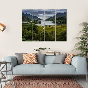This landscape artwork captures a serene view of Loch Shiel, featuring a tranquil lake surrounded by dramatic mountains and trees. With a soft palette of greens, blues, and grays, it evokes a sense of vastness and peace, making it a lovely addition to any space.