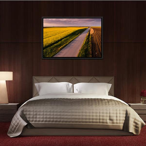 A drone-shot view of a vast canola (rape seed) field with rows of tilled earth, a hint of road, and a cloudy sunset sky in yellow, green, purple, and gray tones. The realistic, naturalistic scene reads peaceful and atmospheric, with clear perspective and depth. Fits well in modern homes or living rooms seeking calm, nature-focused wall decor.