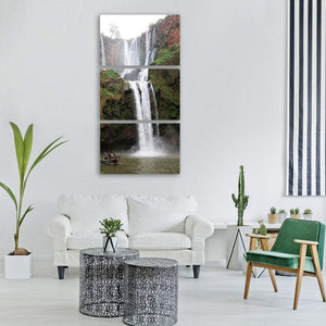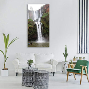 A photorealistic waterfall scene in Morocco, showing people on a boat with the motion of water suggested by shutter speed. The vertical composition and rule-of-thirds framing create slight depth and a serene, adventurous mood. Works well in modern living rooms or nature-inspired spaces.