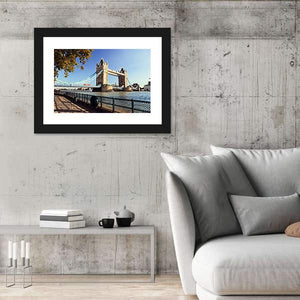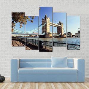 This canvas wall art captures the iconic Tower Bridge alongside the River Thames. With a vibrant palette of blue, beige, and brown, it radiates a sunny, urban feel that enhances any space.