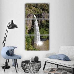 This canvas print shows a waterfall cascading down a sheer rock face, framed by cliffs and lush green vegetation with water churning into white foam at the base. The realistic nature-photography style feels serene and powerful and suits modern or nature-themed rooms as a calm focal point.