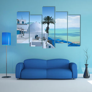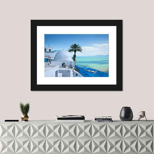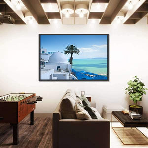 This canvas art captures the serene beauty of Sidi Bou Said with its iconic white buildings and blue roofs set against a tranquil ocean. Featuring a lush palm tree and turquoise water, it brings a sunny, peaceful ambiance to any space.