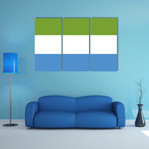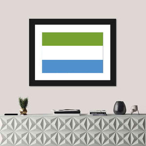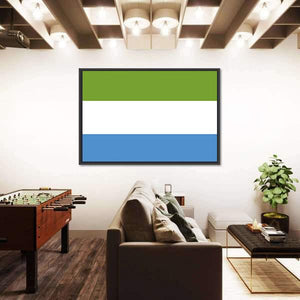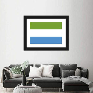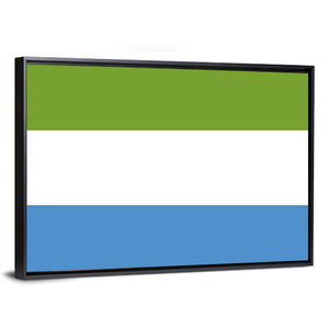 Sierra Leone Flag Canvas Wall Art presents the national flag as three symmetrical horizontal bands in green, white and blue. The abstract, modern minimalist print has a calm, simple, serene feel and works well in modern or minimalist rooms.