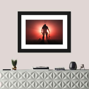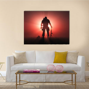 This powerful canvas features the silhouette of a soldier with a rifle, captured under a dramatic sunburst effect. The intense interplay of red, black, and white creates a mysterious atmosphere, making it a striking addition to your wall decor.
