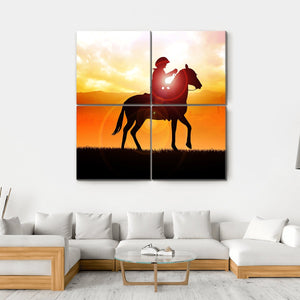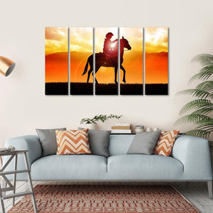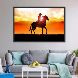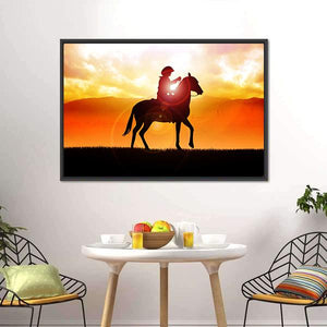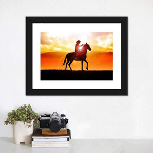 This striking canvas features a silhouette of a person riding a horse against a breathtaking sunset. The warm palette of orange, yellow, and brown evokes a serene and adventurous atmosphere, making it a captivating addition to any art collection.