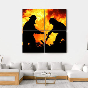 This canvas art depicts the powerful silhouettes of two firefighters amidst intense flames, capturing the dramatic action of a fire scene. The striking palette of black, orange, and yellow enhances the mood, making it a compelling addition to any space.