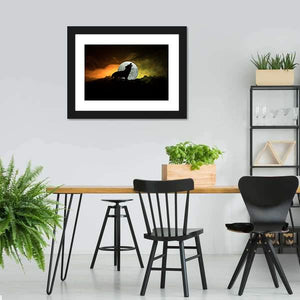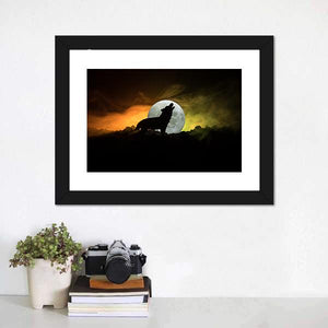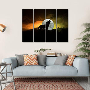 This striking canvas art features a silhouette of a howling wolf set against a full moon, surrounded by wispy clouds. The mysterious and serene atmosphere makes it a captivating piece for any space.