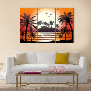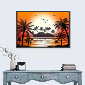 A stylized landscape of a tropical island at sunset featuring silhouetted palm trees, a flock of birds, and their reflection on the water. The orange and yellow palette gives a serene, peaceful mood. Suited to modern or coastal room decor.