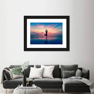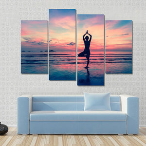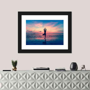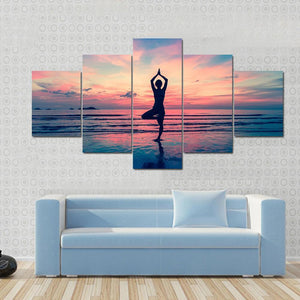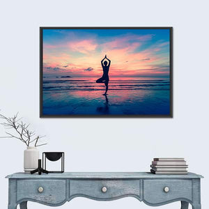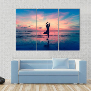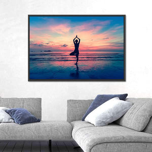 This canvas art features a serene yoga silhouette against a tranquil beach sunset. With calming hues of pink, blue, and orange, it evokes a peaceful atmosphere that enhances any space.