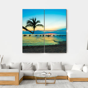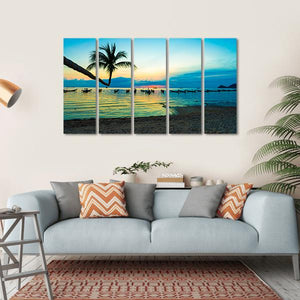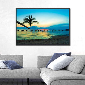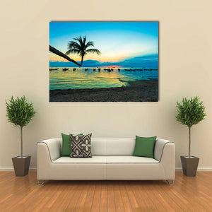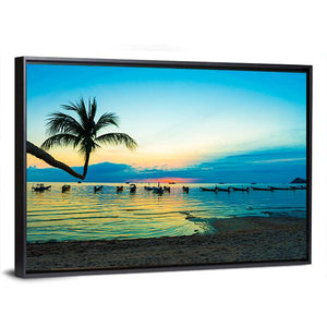 This beautiful canvas art captures a serene sunset over a Thailand beach, featuring a palm tree leaning over the ocean and small boats in the tranquil waters. The vibrant colors of blue, orange, and yellow create a peaceful atmosphere, making it a perfect addition to any wall decor.