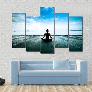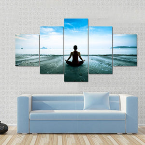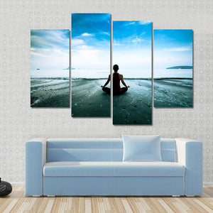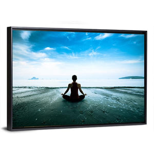 This canvas art features a silhouette of a young woman meditating on the beach, surrounded by the calming ocean and sky. The serene palette of blue, green, and grey adds a peaceful vibe, perfect for creating a meditative atmosphere in any space.