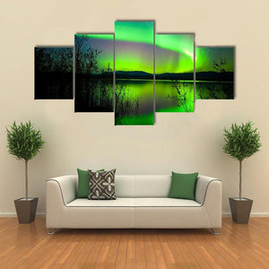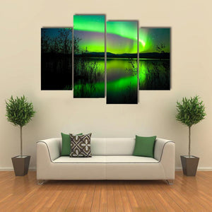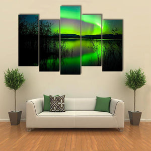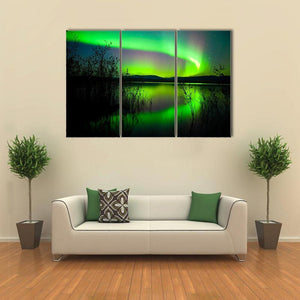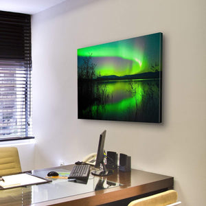 This canvas art captures the ethereal beauty of the aurora borealis reflected over the tranquil waters of Lake Laberge. The composition features a serene night sky filled with stars and silhouettes of trees and reeds, making it a magical addition to your nature-themed decor.