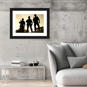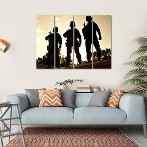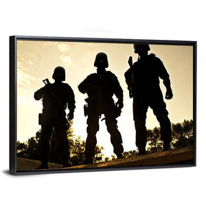 This canvas wall art features the powerful silhouettes of S W A T officers holding their guns in a dramatic low-angle shot. The intense colors of yellow, orange, brown, and black evoke a serious and heroic mood, making it an impactful piece for any military-themed décor.