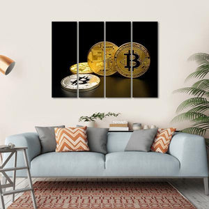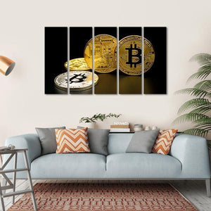 This captivating artwork features a close-up of bitcoin coins in a sleek palette of gold, silver, and black. The modern vibe evokes a sense of wealth and financial prosperity, making it a striking addition to your wall decor.