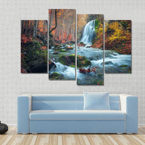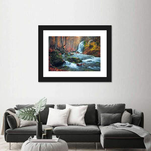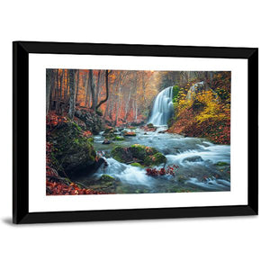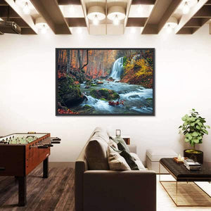 This captivating artwork features a serene waterfall flowing through the Grand Canyon of Crimea, surrounded by autumn foliage. The natural hues of green, orange, and brown evoke a tranquil atmosphere, making it a beautiful addition to any space.