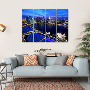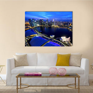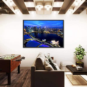 Capture the urban vibrancy of Singapore at night with this striking canvas wall art. Featuring a high-angle view of the city skyline, this piece showcases glowing city lights and distinct modern architecture reflecting on the water, creating a bustling, illuminated atmosphere.