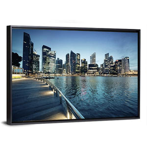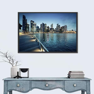 This canvas print shows Singapore’s skyline along the waterfront at sunset, with illuminated buildings mirrored in reflective water. The wide-angle, elevated view and cool blue-gray palette create a serene, modern urban mood that suits contemporary living rooms or office spaces.