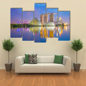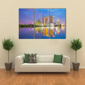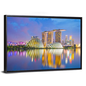 This canvas wall art features a vibrant cityscape of Singapore, showcasing modern architecture and the waterfront skyline at twilight. The serene palette of blue, gold, pink, and purple reflects the glowing towers and dome-shaped conservatories, perfect for adding a contemporary touch to your decor.