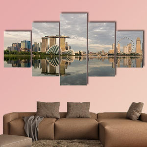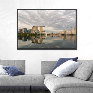 Singapore Marina Bay In Morning Canvas Wall Art depicts the city skyline with modern buildings, a ferris wheel and calm, reflective water. The blue, gray, white and gold palette creates a serene, grand mood and fits modern living rooms and other home spaces.