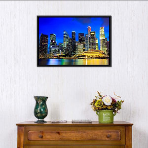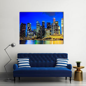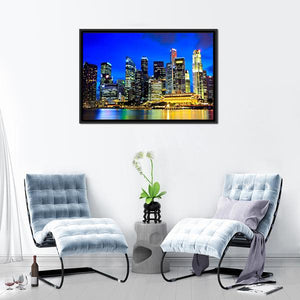 This canvas art captures the vibrant skyline of Singapore, showcasing its skyscrapers against a nighttime backdrop. The colorful palette features blue, yellow, and green tones, with lights reflecting beautifully on the water, adding an urban and lively atmosphere to your space.