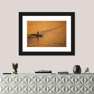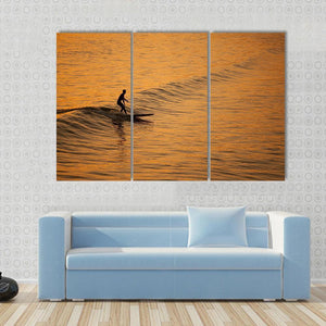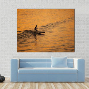 This eye-catching piece captures the silhouette of a surfer against a serene sunset over a calm ocean. The warm hues of orange and yellow create a peaceful yet adventurous vibe, making it a suitable addition to any modern decor.