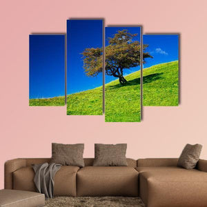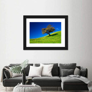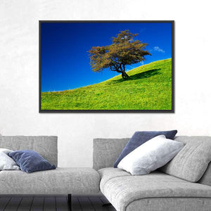 This realistic landscape shows a single tree on a green meadow, sitting on a gentle slope beneath a clear blue summer sky with a faint cloud. Its rule-of-thirds composition and peaceful, tranquil mood make it a calm choice for modern home rooms or nature-themed spaces.