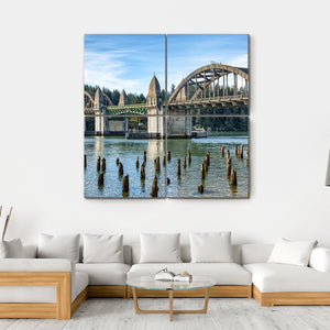 This canvas art features the majestic Siuslaw River Bridge in Florence. The serene scene showcases an arch bridge with domed towers framed by calm water and weathered pilings, creating a tranquil atmosphere that's perfect for any space.