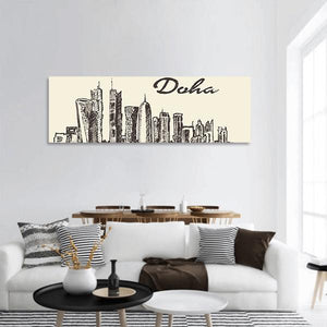 Doha skyline rendered in a hand-drawn sketch style, centered with the cursive 'Doha' text. The black, white, and beige palette gives a modern, architectural, graphic feel that suits contemporary or minimalist rooms.